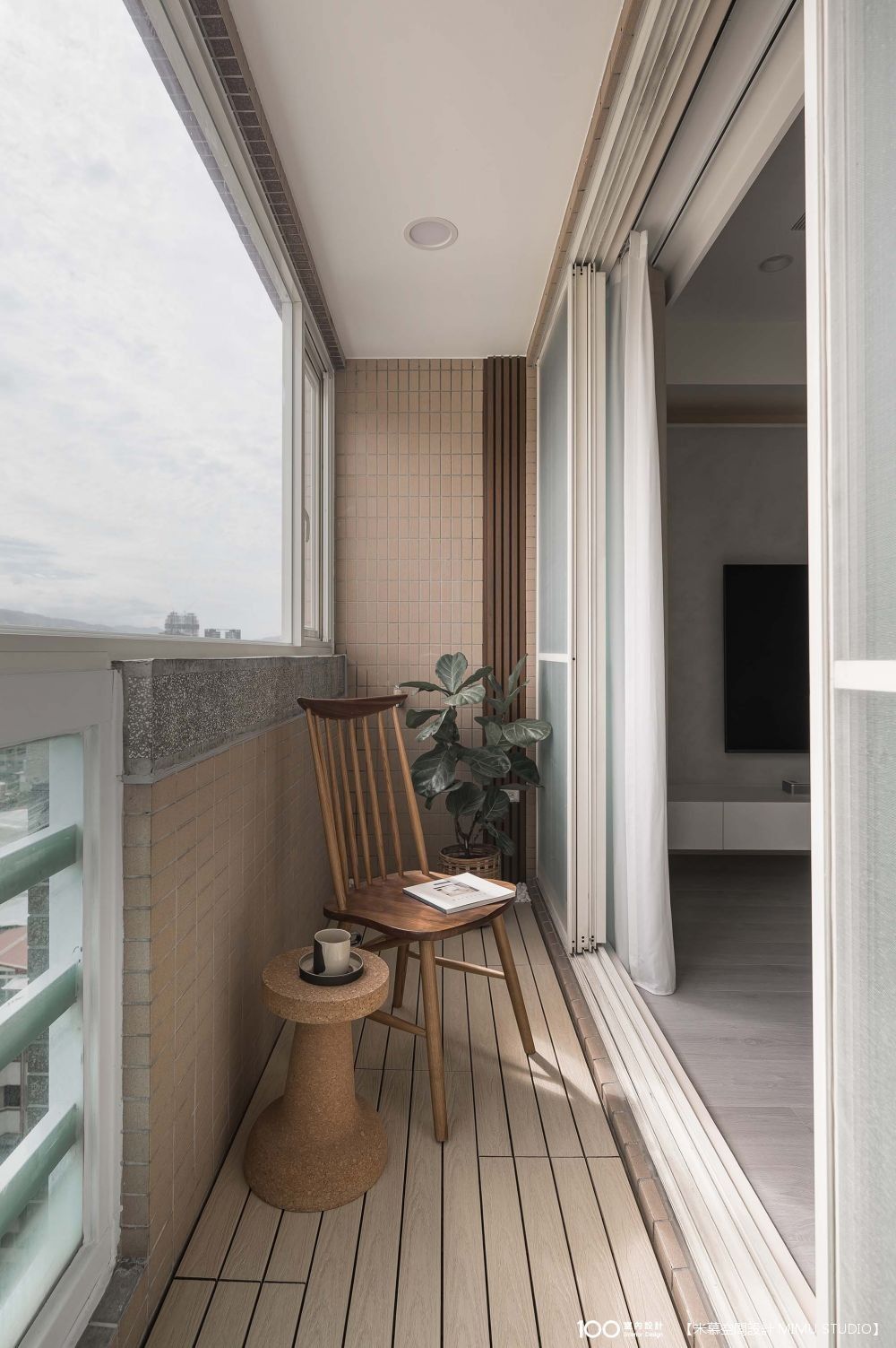 ▲陽台選用 塑木地板,更好清潔維護,設計師也有配置一組插座,我們就能在此用筆電。