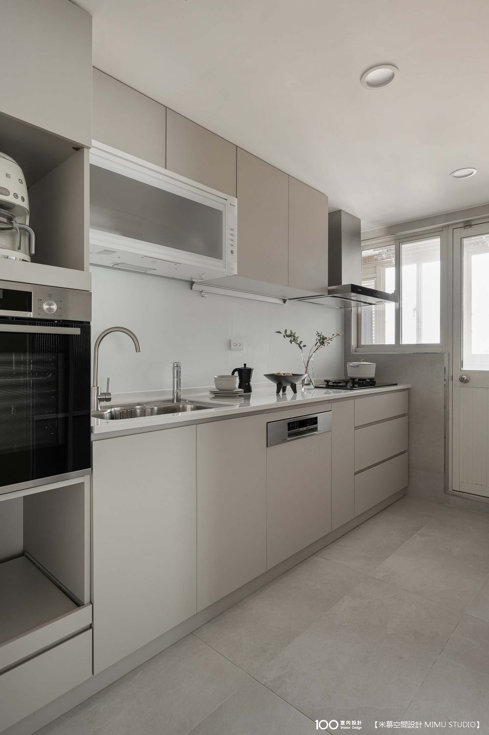▲廚房選用 長虹玻璃拉門,讓光線穿透,門片上的白色線型把手設計,則讓門看起來不會太制式。