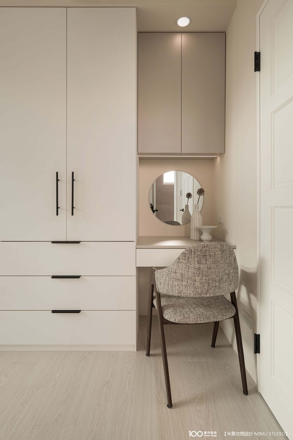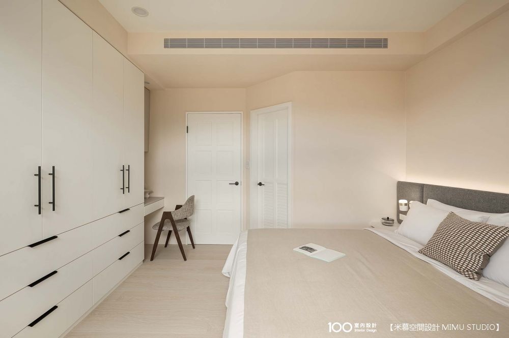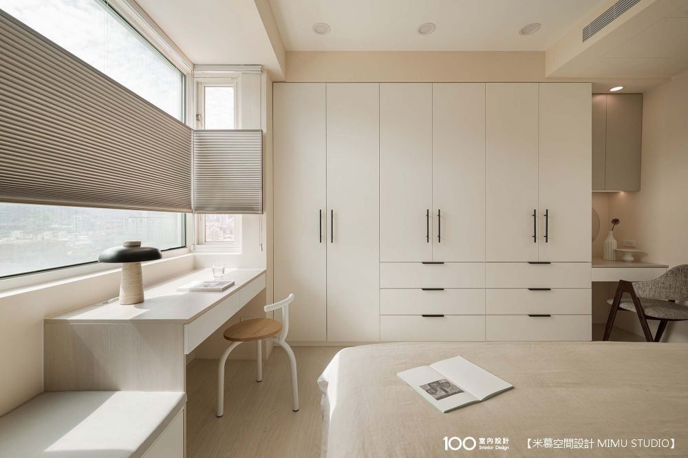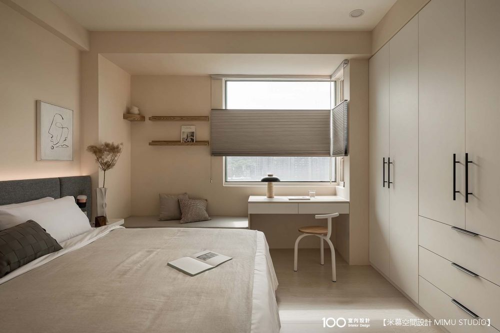 主臥延續公區的奶茶色調,休憩氛圍相當溫馨,主臥床頭則加入深灰色做跳色,可平衡整體視覺的粉嫩感,而除了床、衣櫃之外,也規劃了書桌、梳妝台和臥榻,辦公累的時候,就可以坐在臥榻上看風景休息放鬆。