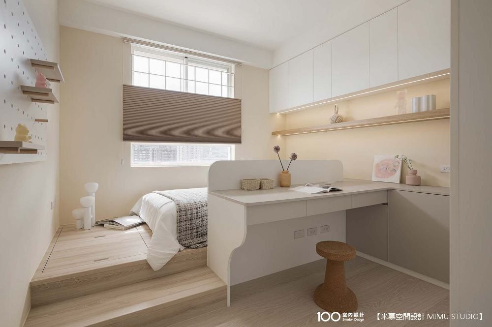 這是姐姐的房間,選用她指定的鵝黃色,整體相當的療癒夢幻,設計師特別將地板架高、將床結合書桌設計,並把書桌的背板做高一點,進門時不會直接看到床,更具隱私性,也能將休息和閱讀的空間分開。