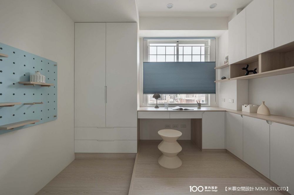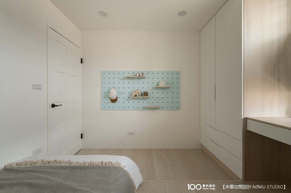 弟弟的年紀小,目前就以簡單設計為主,除了床、衣櫃,也於採光最佳處規劃書桌區,並特別選用他喜歡的天空藍來跳色點綴空間,像是窗簾、洞洞板、床頭繃布。