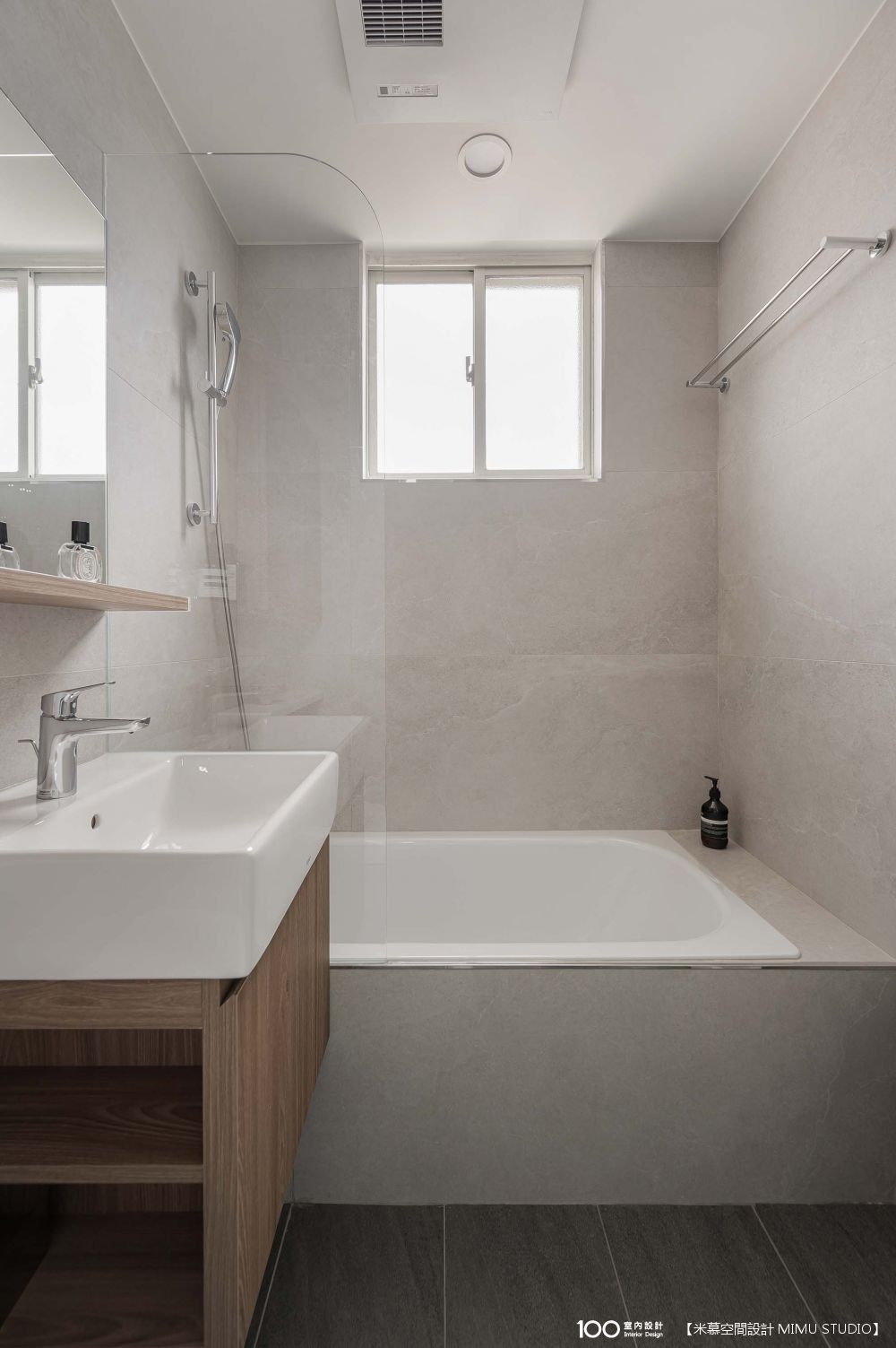孩子們很喜歡泡澡,所以主衛浴有設置浴缸,但因空間不大沒辦法做玻璃拉門,改以半片玻璃阻隔,或多或少有防潑水的作用。