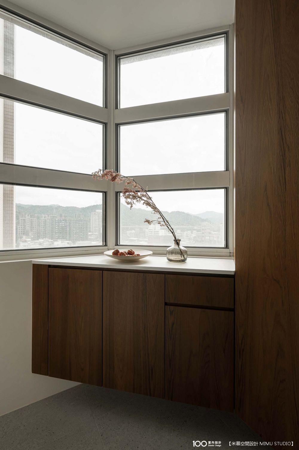 【玄關】玄關的採光很棒,我們選擇犧牲其中一面採光(對著對面住戶的窗戶),來打造鞋櫃,可維護隱私又能增加收納機能,不過因為先生的鞋子尺寸比較大,如果櫃子是採用一般正常平放的方式,會占用過多空間,設計師便改以斜面設計,既滿足收納,也不影響採光,且特別選用深棕色板材比較耐髒。