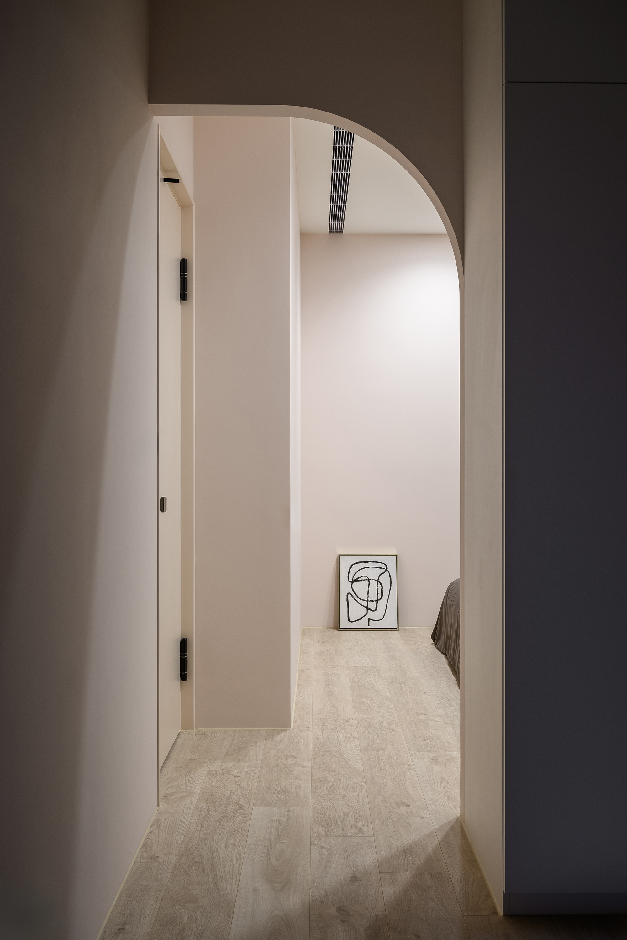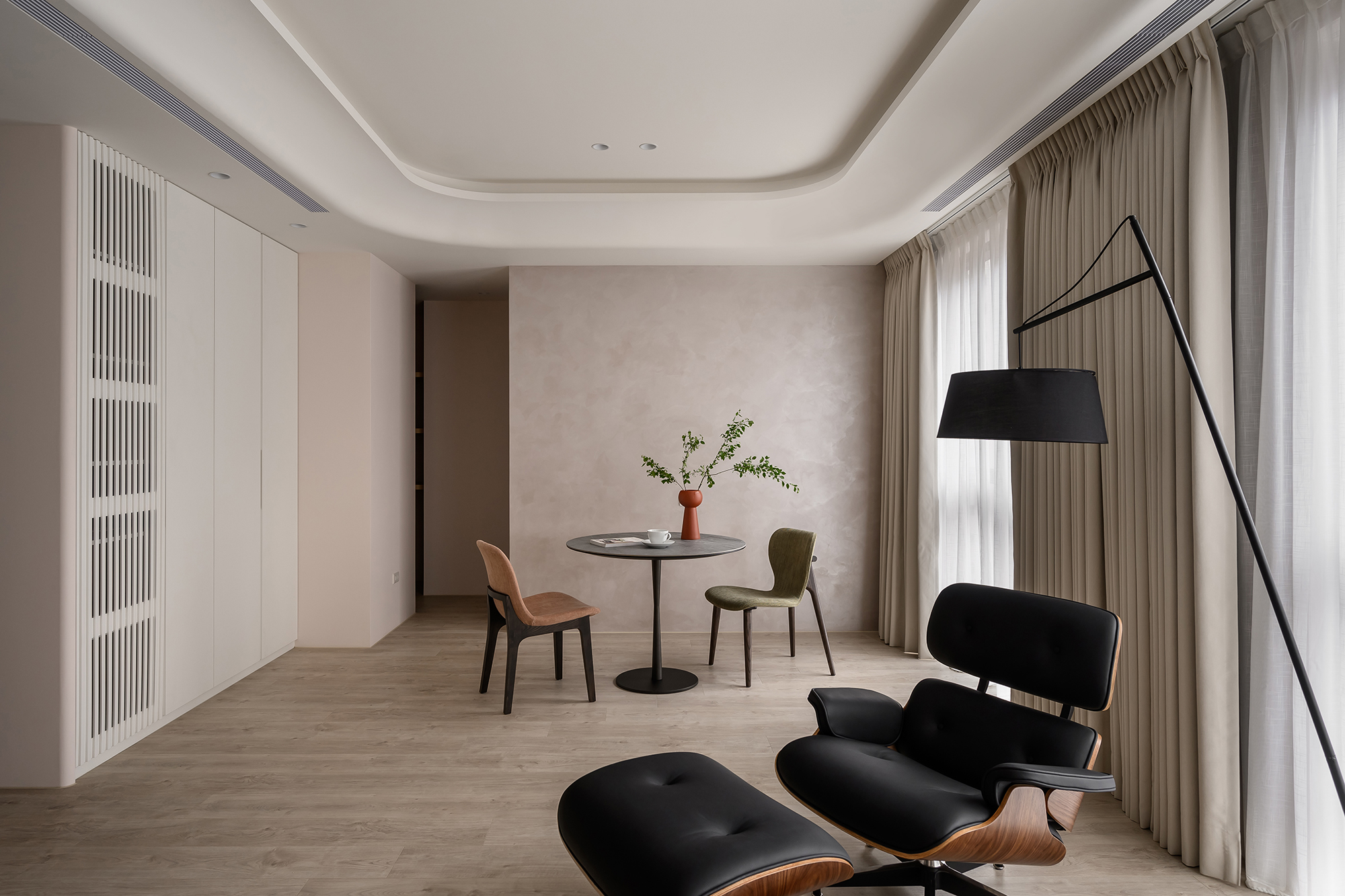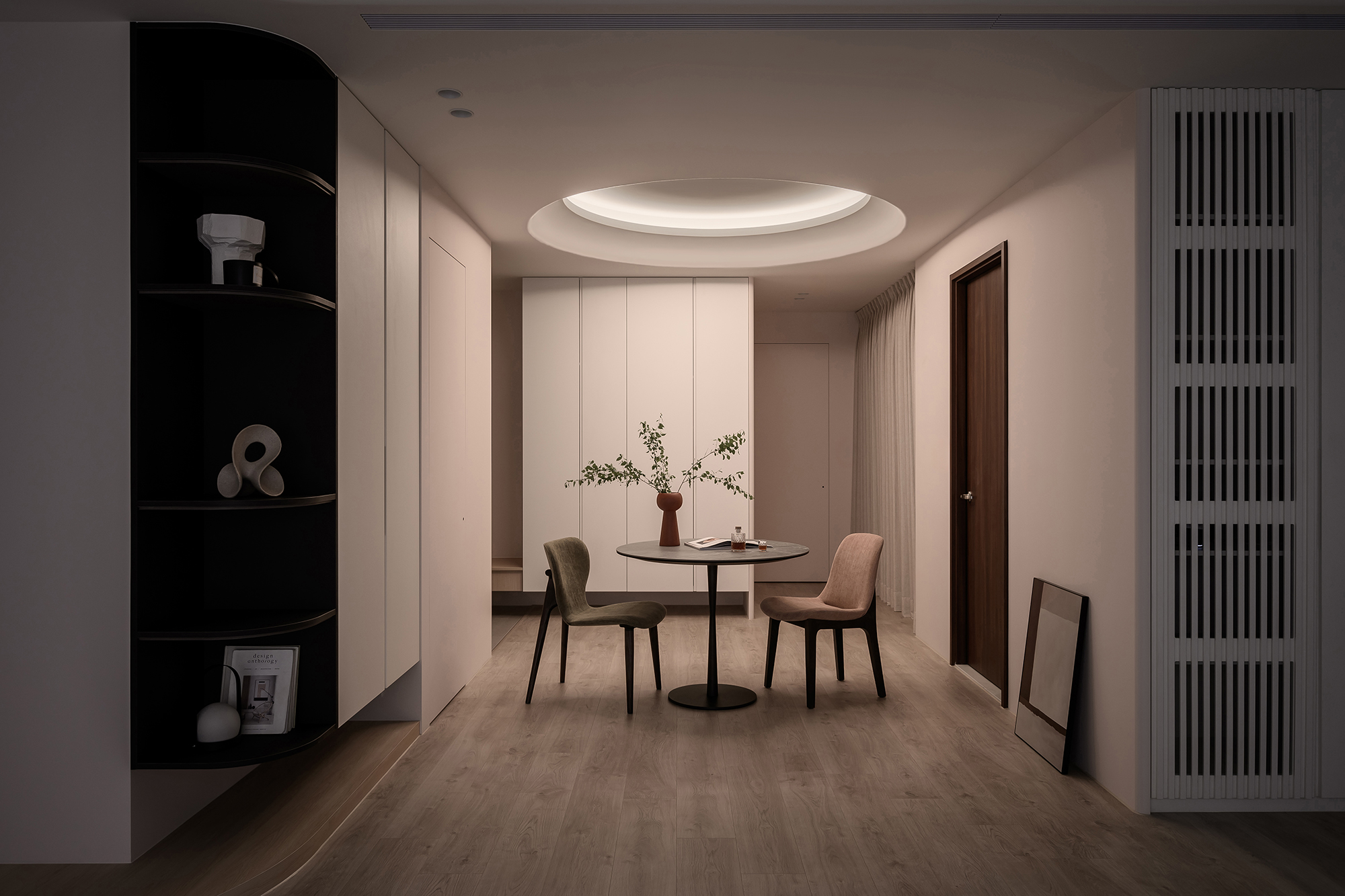 This residential planning and design project is thoughtfully centered around the core elements of “open space, rounded forms, and tranquility.” The objective is to cultivate a luxurious and elegant living environment that invites residents to both socialize and savor moments of solitude. To achieve this vision, the overall design is anchored in a harmonious palette of low-saturation latte tones, seamlessly paired with gray-brown wood flooring. This grounding creates a warm and inviting atmosphere. Furthermore, the minimalist furniture layout, characterized by elegant curved lines, not only enhances the aesthetic appeal but also effectively defines the spatial areas within the home. Importantly, this approach prioritizes both comfort and safety, skillfully addressing the contemporary resident's need for sophistication while ensuring functional living spaces. In essence, this design strives to create a sanctuary that balances elegance with practicality, enhancing the overall quality of life for its inhabitants.