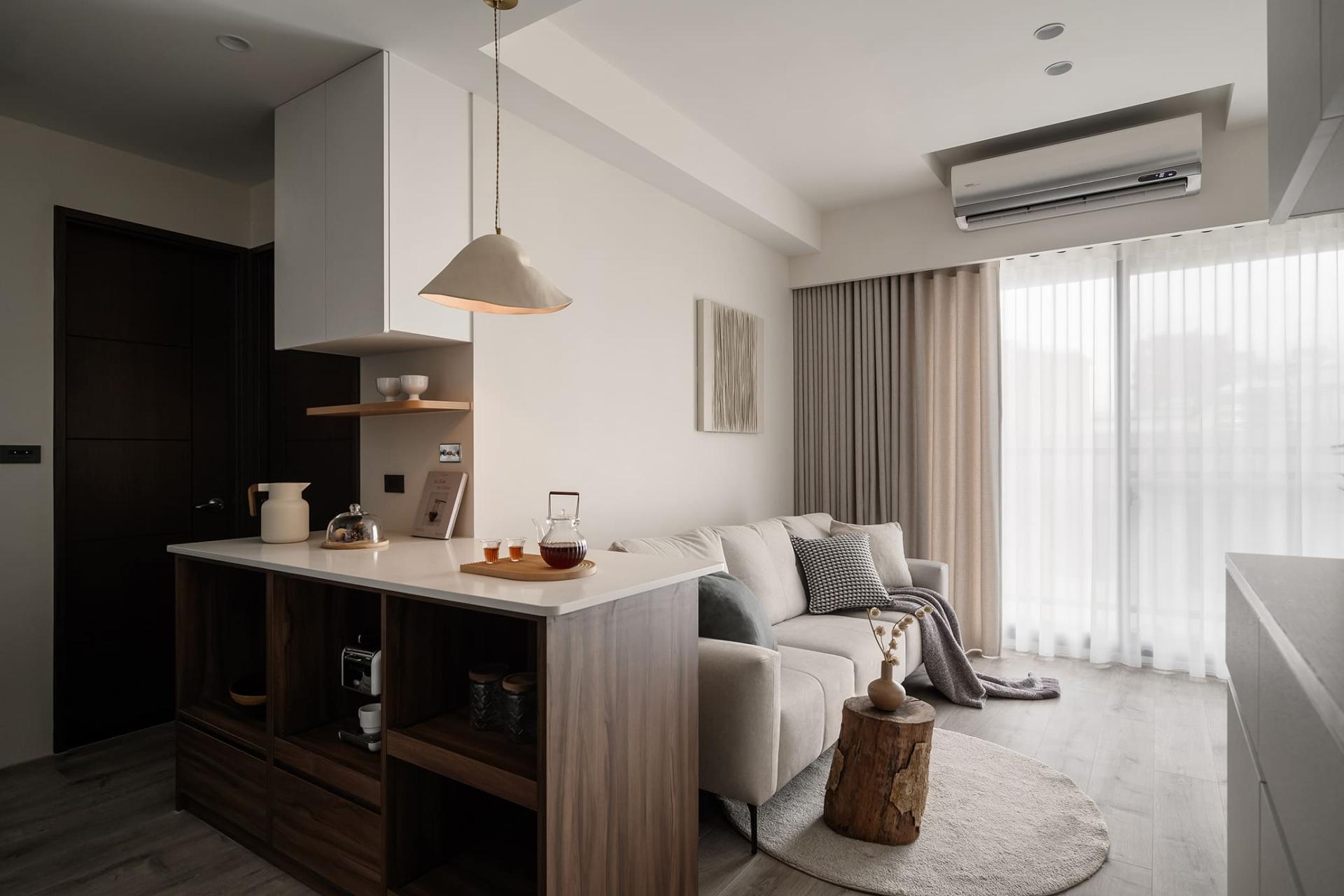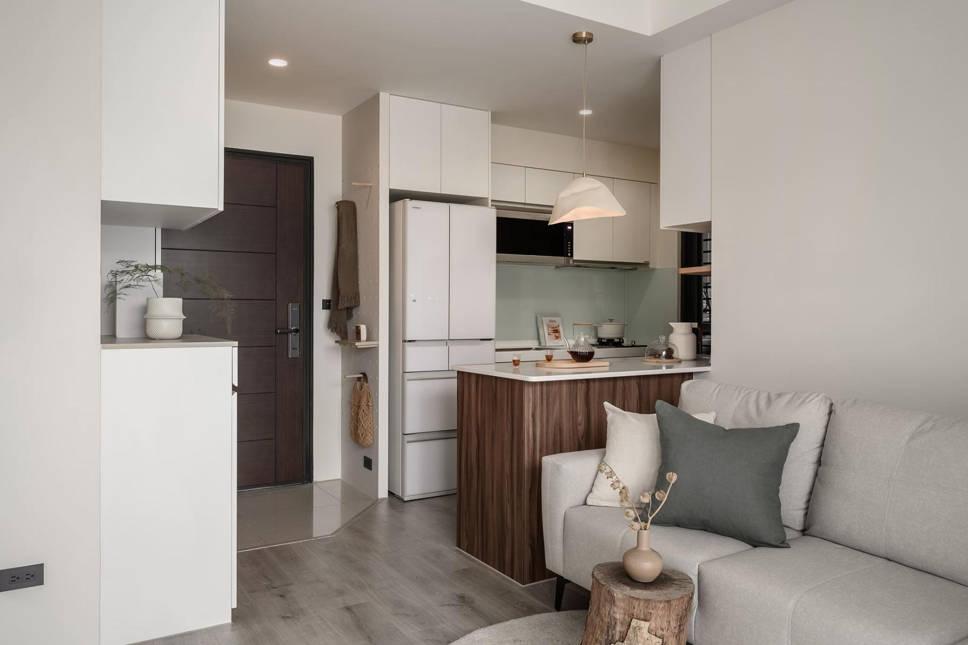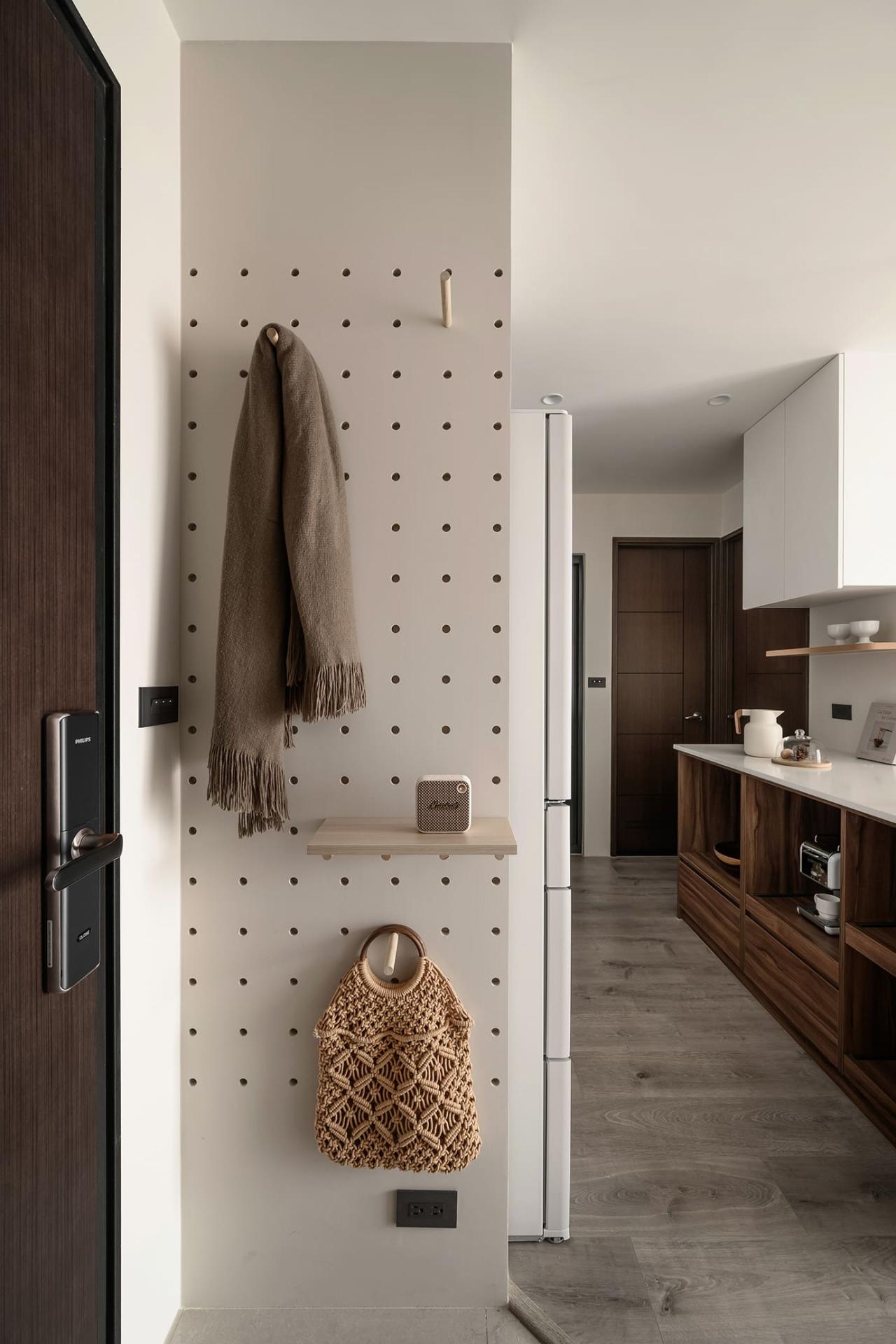 In the public area, the team tailored a 28cm-deep shoe cabinet in response to spatial constraints. Its angled adjustable shelving dramatically improves both storage flexibility and utility. Mirrored cabinet doors serve a dual function as full-length dressing mirrors and visual expanders, while a nearby pegboard partition adds versatility to the transitional zone. The open-plan kitchen island acts as a central node, seamlessly connecting the entry, living, and kitchen areas. It combines storage functionality with intuitive flow. A contrast between rich wood veneer panels and sleek white overhead cabinets enhances spatial depth and creates a compelling visual focal point. Generous windows paired with soft indirect lighting allow natural light to filter gently through the interiors, shaping a quiet, luminous atmosphere throughout the day.